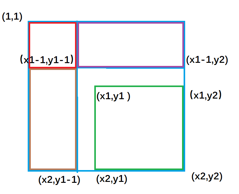 (x1 - 1, y2)右下角的矩形面积 ,黄色面积是指(1, 1)左上角到(x2, y1 - 1)右下角的矩形面积;