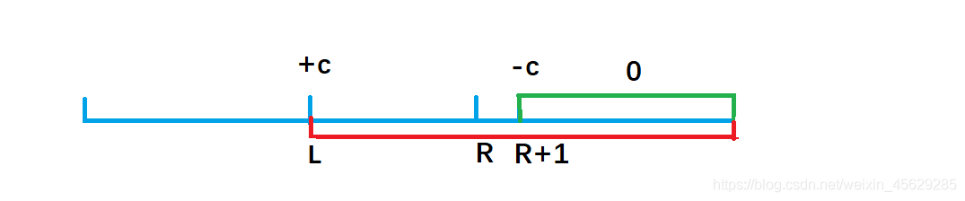b[l] + c,效果使得a数组中 a[l] 及以后的数都加上了c(红色部分),但我们只要求l到r 区间加上 c, 因此还需要执行 b[r + 1] - c,让a数组中 a[r + 1]及往后的区间再减去c(绿色部分),这样对于a[r] 以后区间的数相当于没有发生改变。