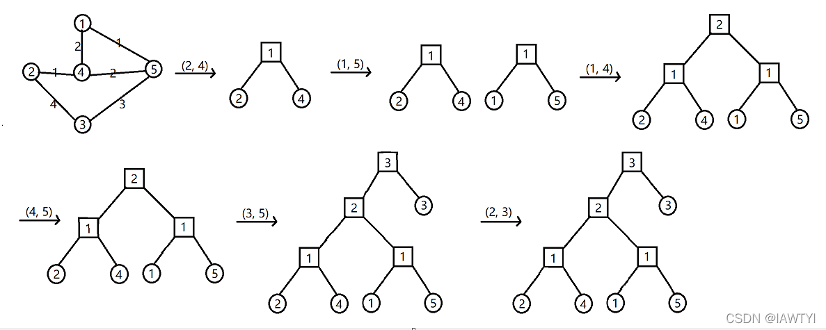 克鲁斯卡尔重构树的思想就是在建最小生成树的时候不是直接连边,而是新建一个节点,并把这个节点的值设为边权,然后令两个连通块的代表点分别作为它的左右儿子。然后令这个新节点成为整个连通块的代表点