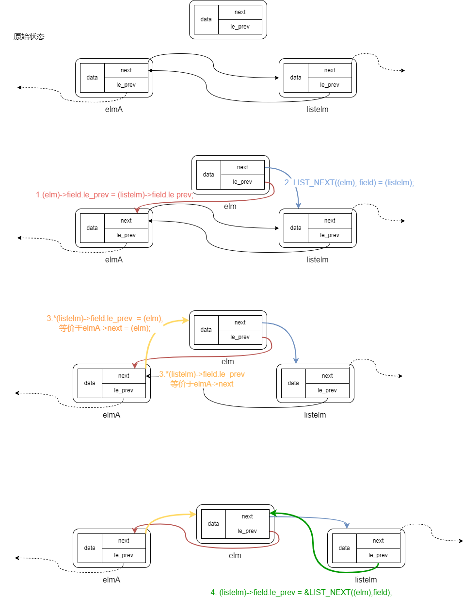 这里在实际操作时对你的指针能力是一个极大的挑战,需要我们对链表的增删改查十分熟悉,值得一提的是该链表实际上是一个双向链表,但和我们常见的双向链表又有区别。该双向链表可以直接通过le_next来访问下一个链表项,但却无法直接访问上一个链表项。因为le_prev仅仅是指向了前一个Page的le_next,换句话说,就是一个指向了"指向自己的指针"的指针。虽然le_prev无法帮助我们直接访问上一个链表项,但是,它却可以帮助我们以O(1)的开销实现链表的增删操作。在此奉上一文gg亲手画的链表前插入的解析图,供大家理解一下与正常链表插入的差异。